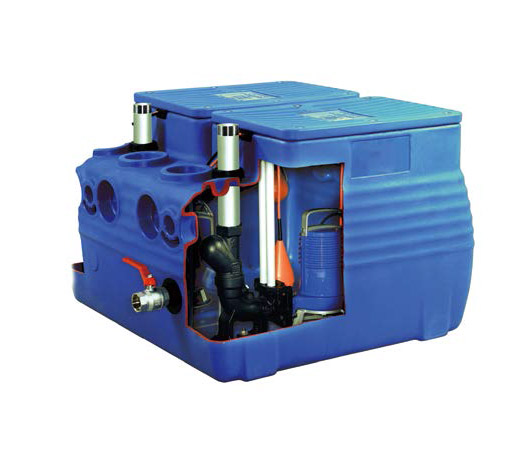 雙泵污水提升站產品性能(一用一備) 輸入功率:0.75~1.5kw 最大揚程:25.5m 最大流量:20l/s 污水入口:直徑50~125(mm) 工作電壓:380v/220v